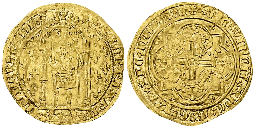Provence. Louis I d'Anjou (1382-1384). AV Franc à pied (30 mm, 3.77 g), Avignon, 1er type. Av. LVDOVICVS DVX KALABRI AND, le Duc debout. Rv. + XPC VINCIT XPC REGNAT XPC IMPERAT, croix trèflée avec quadrilobe anglé en cœur contenant un point. Bd. 860; Dupl. 1690.