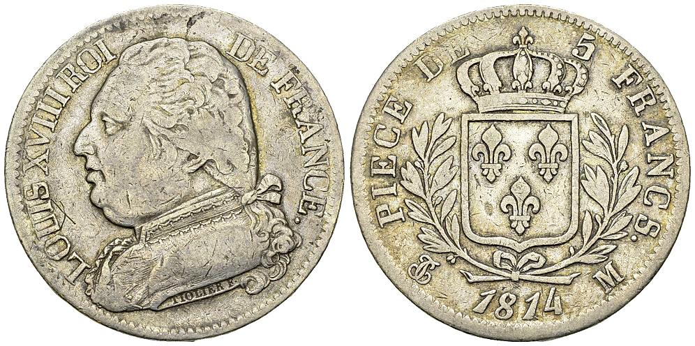 Lot 111. Louis XVIII, AR 5 Francs 1814 M, Toulouse