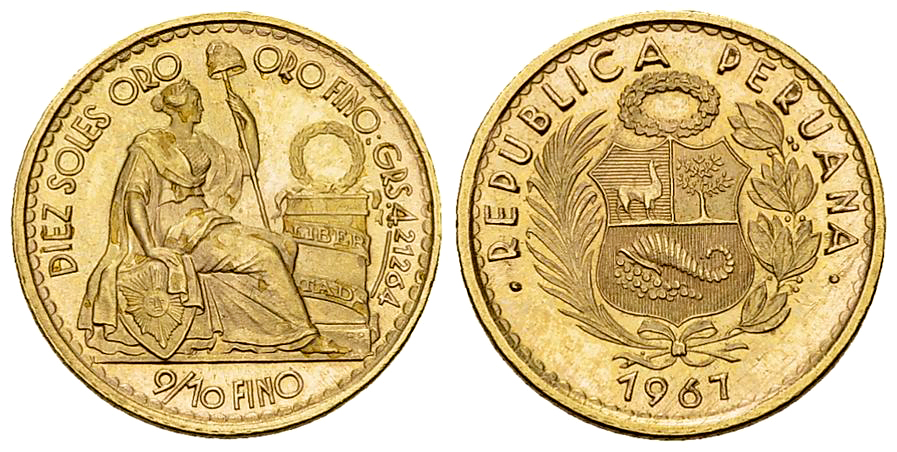 Peru, Republic. AV 10 Soles 1967 (4.69 g). KM 236.