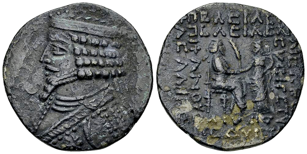 Rev. Phraates seated right, receiving palm from Tyche standing left before.
