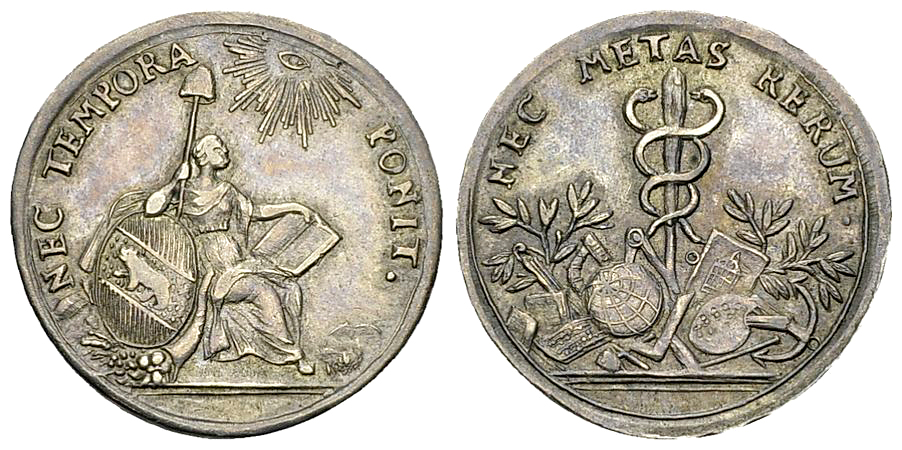 Rv. NEC METAS RERUM·, aufrecht stehende Keule, von zwei Schlangen umwunden, zwischen Symbolen der Künste und Wissenschaften.
