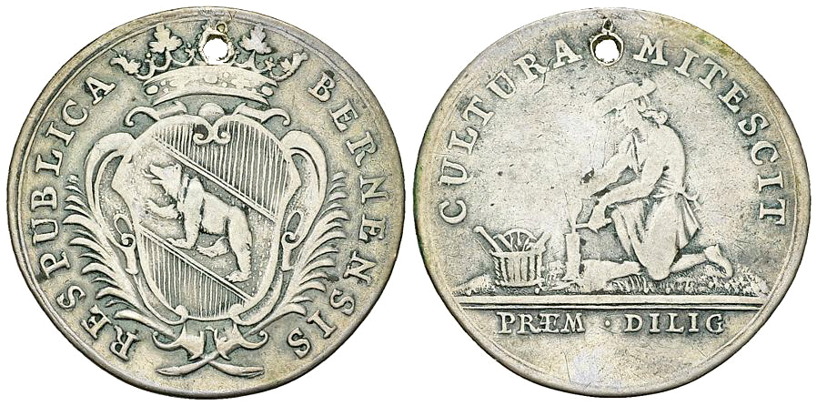 Rv. CULTURA MITESCIT ·, Kniender Gärtner nach links, einen jungen Baum einpflanzend; im Abschnitt PRÆM · DILIG.