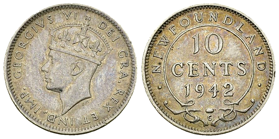 Canada. Newfoundland. AR 10 Cents 1942 (2.34 g). KM 20.