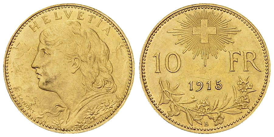 Schweiz, Eidgenossenschaft. AV 10 Franken 1915 B (3.22 g). Bern. Vreneli.