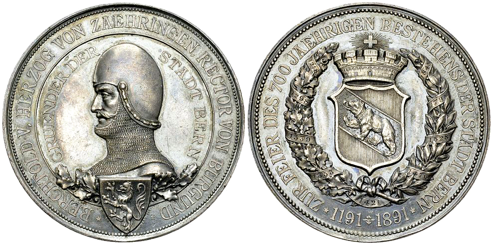 Bühler und F. Homberg. Av. Behelmte Idealbüste des Stadtgründers Berchtolg V von Zähringen nach links über Zähringerwappen. Rv.