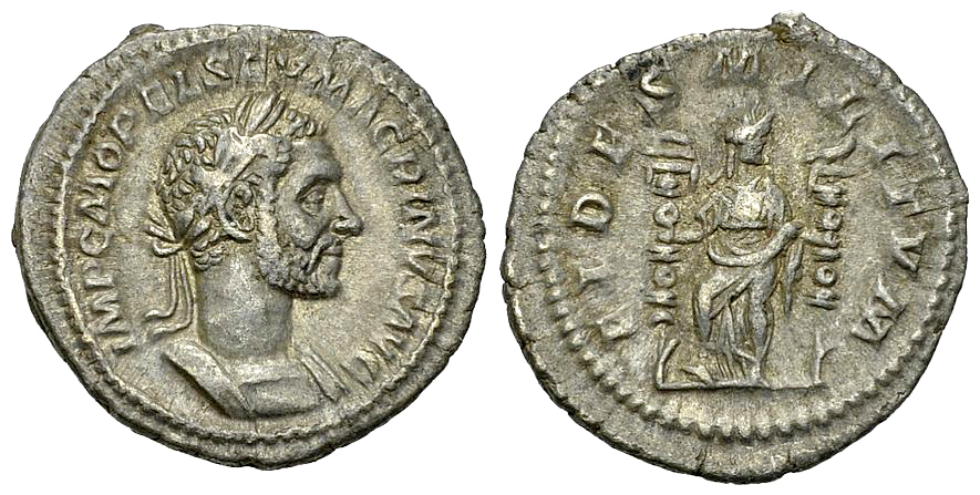 Obv. IMP C M OPEL SEV MACRINVS AVG, Laureate and cuirassed bust to right.