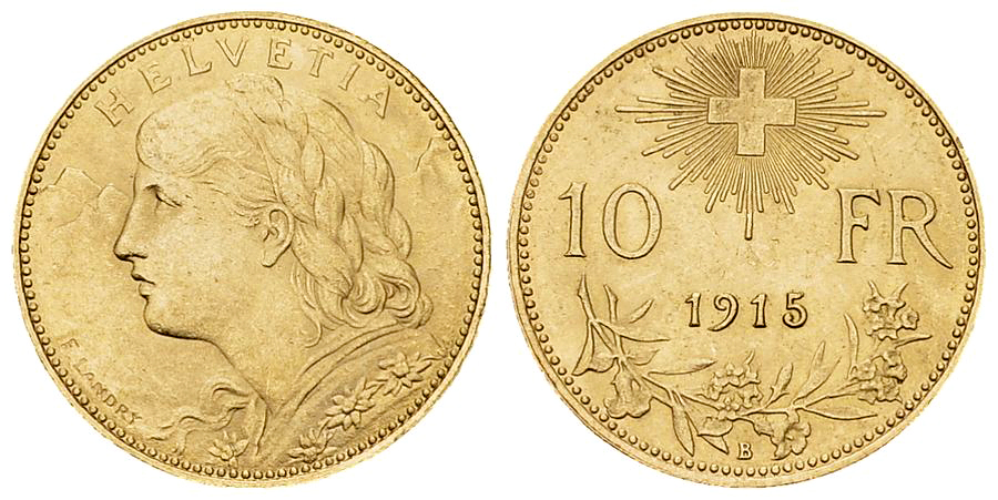 Schweiz, Eidgenossenschaft. AV 10 Franken 1915 B (3.22 g). Bern. Vreneli.
