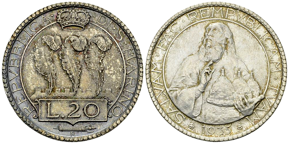 San Marino. AR 20 Lire 1935 R (36 mm, 14.94 g), Roma.