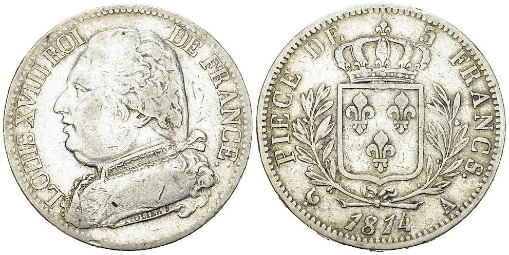 France, Royaume. Louis XVIII (1814-1824). 1ère restauration. AR 5 Francs 1814 A (37 mm, 24.82 g), Paris. Gad. 591.