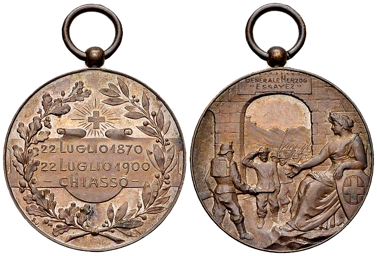 Schweiz. Tessin/Ticino, Chiasso. AE Medaille 1900 (28 mm, 10.92 g), 22. luglio 1870 - 22. luglio 1900, GENERALE HERZOG / "ESSAYEZ". Selten. Mit Originalhenkel. Unzirkuliert.