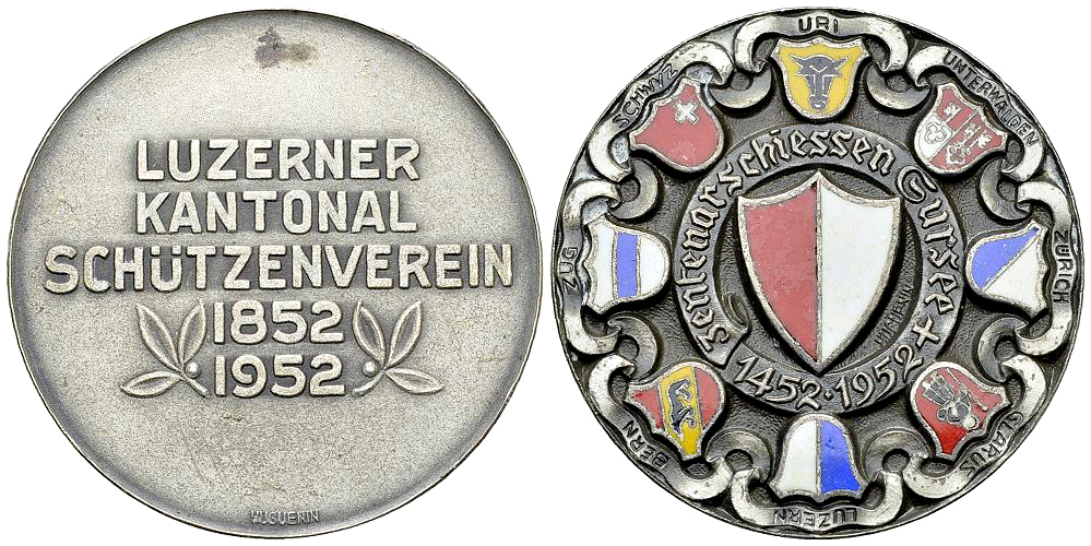 Schweiz, Luzern. Sursee. Versilberte und teilemaillierte AE Medaille 1952 (38 mm, 26.35 g), Zentenarschiessen des Luzerner Kantonalschützenvereins. Richter 925a (R).