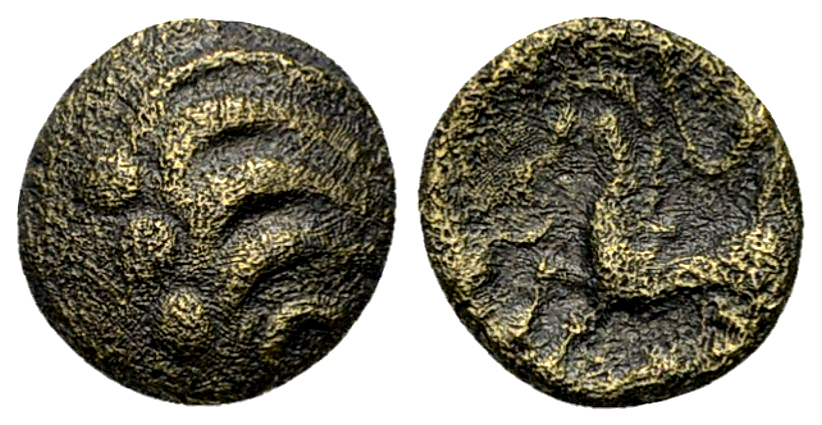 Celtic Gaul. Remi. Debased, gold-plated AE 1/4 Stater (11 mm, 1.16 g), 'à la griffe' type, 2nd-1st century BC. Obv. Devolved head to left. Rev. Horse springing left;