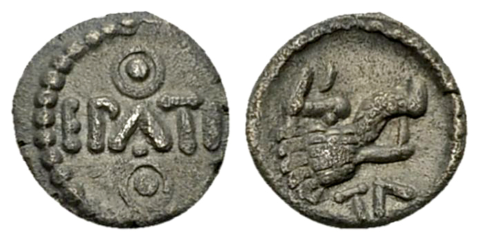 Minimus (8mm, 0.25 g), c. 35-43 AD. Epaticcus Boar's Head type (Atrebatic L). Obv. EPATI; pellets-in-annulets above and below. Rev. Boar's head to right; T A