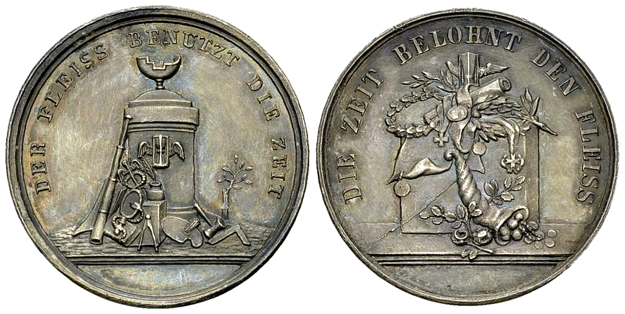 Zeit, davor Embleme von Kunst und Wissenschaft. Rv. DIE ZEIT BELOHNT DEN FLEISS, Altar mit Lorbeerzweig und -kranz,