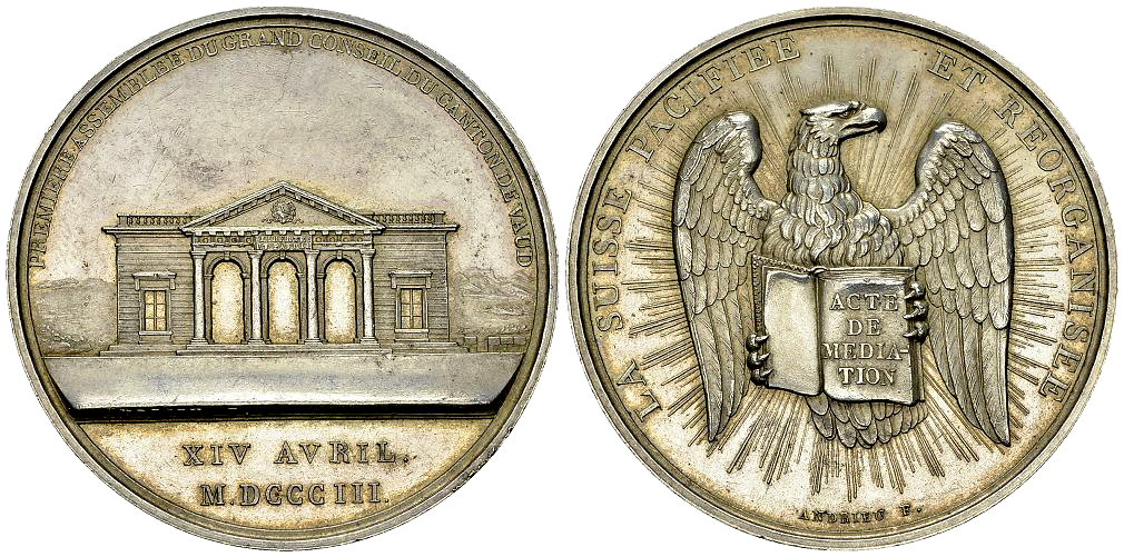 Schweiz, Waadt/Vaud. AR Medaille 1803 (46 mm, 50.28 g), auf die erste Sitzung des Grossen Rats. Von B. Andrieu. Av. Parlamentsgebäude. Rv. Adler hält die Mediationsakte.