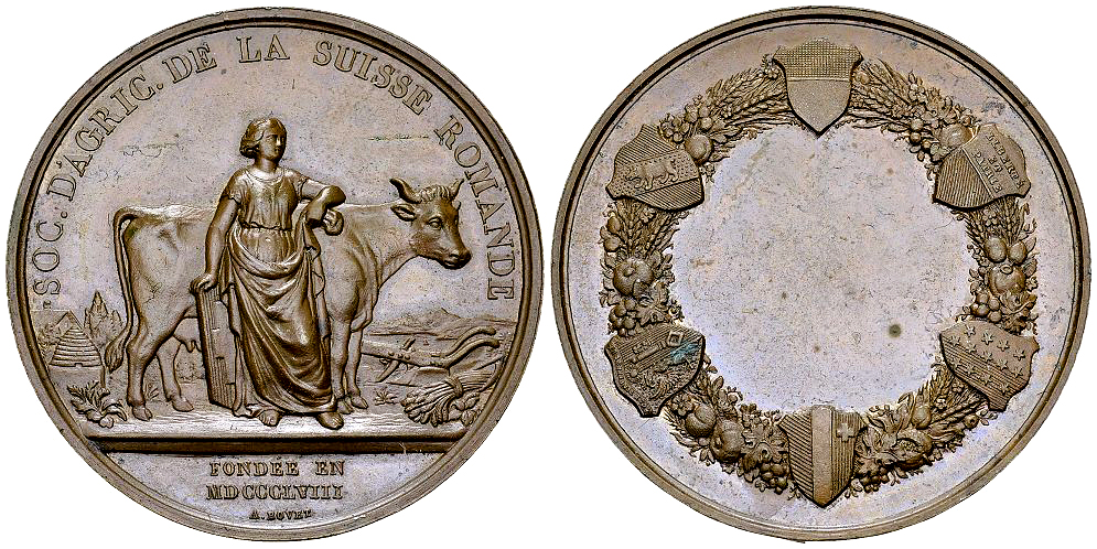 Schweiz. Romandie. AE Medaille 1858 (46 mm, 52.16 g), Société d'Agriculture de la Suisse romande. Von A. Lovet. Lavanchy 303.