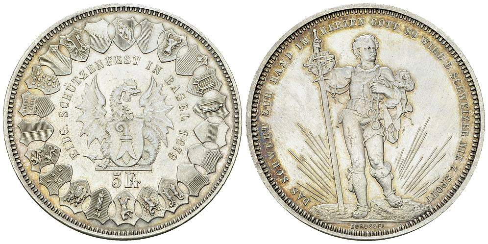 Los 409. Basel, AR 5 Franken 1879, Eidg. Schützenfest