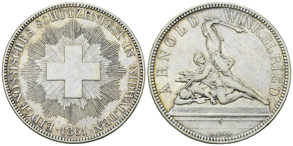 Schweiz, Eidgenossenschaft. Nidwalden. AR Schützentaler zu 5 Franken 1861 (24.75 g), Eidgenössisches Schützenfest in Nidwalden.
