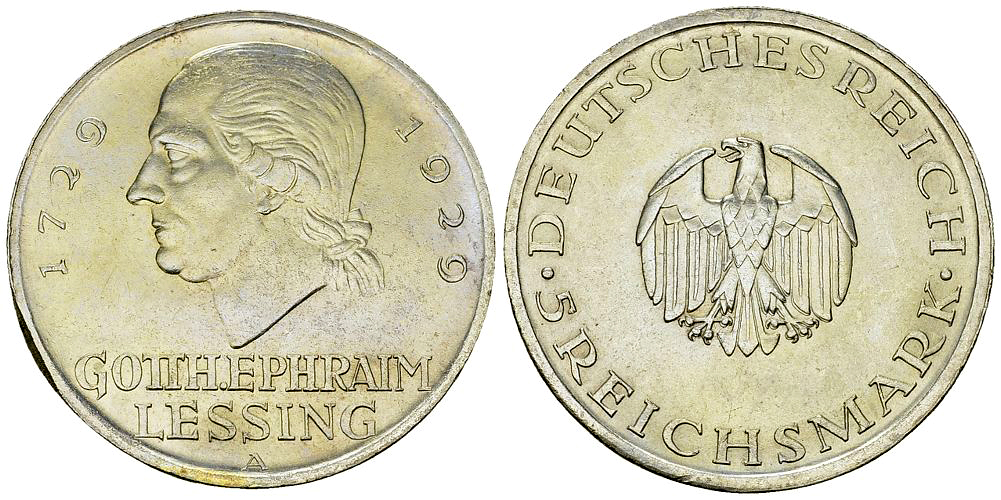 Deutschland, Weimarer Republik. AR 5 Reichsmark 1929 A (25.02 g). Gotthold Ephraim Lessing.