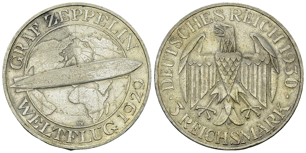 Lot 206. Weimarer Republik, AR 3 Reichsmark 1930 G, Zeppelin
