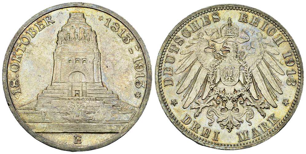 Deutschland, Sachsen. AR 3 Mark 1913 E (16.66 g), auf die 100-Jahrfeier der Schlacht von Leipzig.