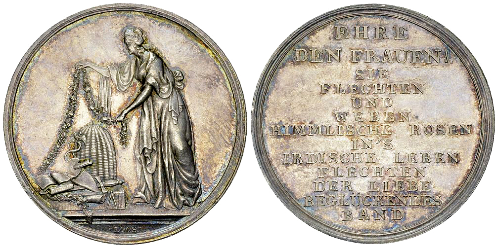 Bienenkorb mit Girlande. Rv. "Ehre den Frauen ! Sie flechten und weben