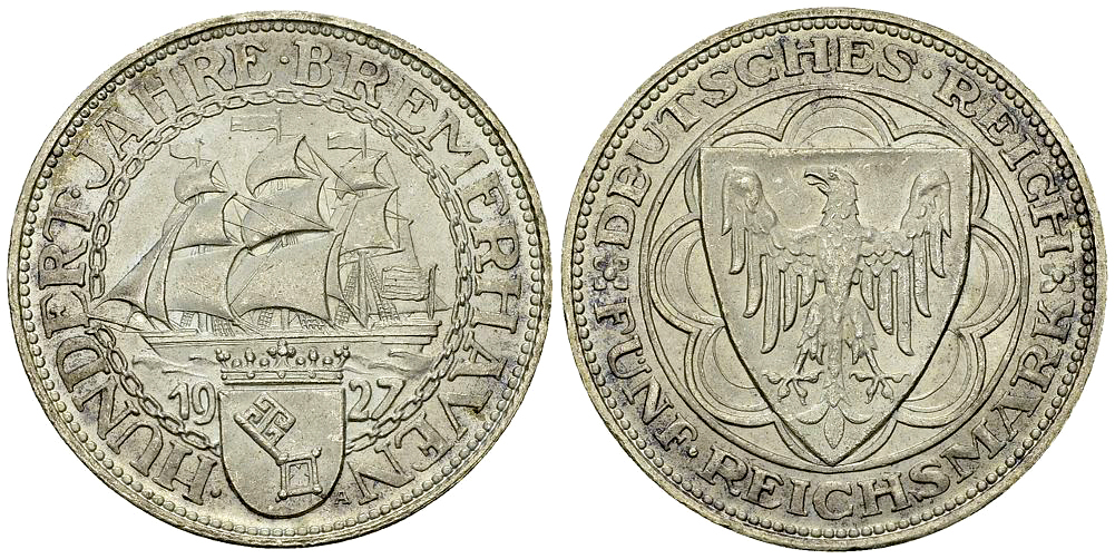 Lot 191. Weimarer Republik, AR 5 Reichsmark 1927 A, Bremerhaven