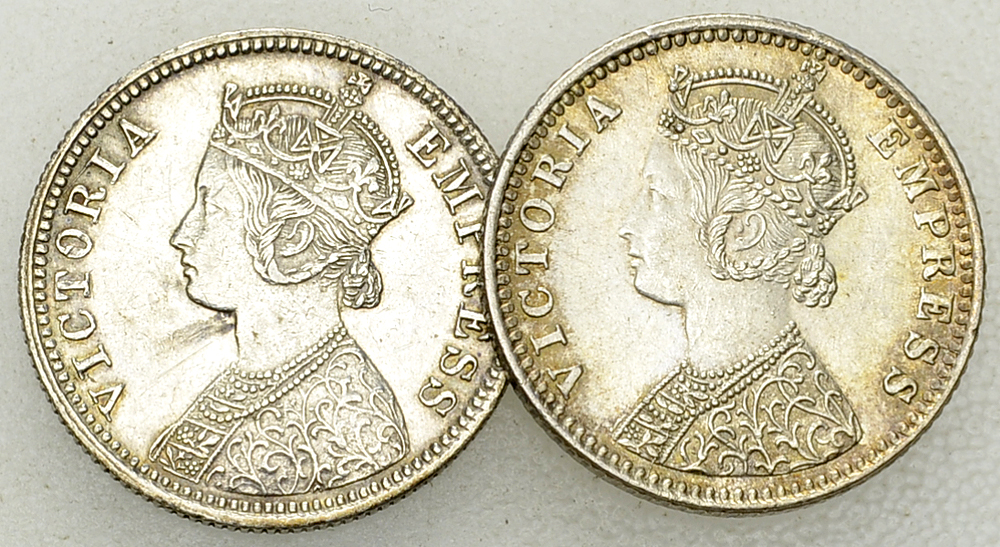India, British. Lot of 2 (two) AR 1/4 Rupees 1881, and 1887.