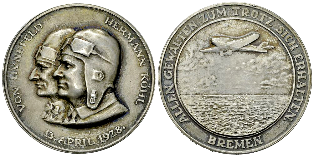Ost-West-Ozeanflug der "Bremen". Rand: Bayer. Hauptmünzamt.Silber 900 f.