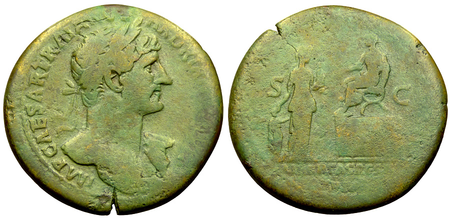 Hadrianus (117-138 AD). AE Sestertius (35-36 mm, 25.99 g), Roma (Rome), 119-121 AD. Obv. IMP CAESAR TRAIANVS HADRIANVS AVG, laureate bust right, drapery on left shoulder. Rev. PONT MAX TR POT COS III / S C / LIBERTAS RESTITVTA, Hadrian seated left on platform on right, extending right hand; facing him, woman standing right holding child on left arm and placing right hand on head of a second child at her side. RIC III, p. 411, 568 (R2).