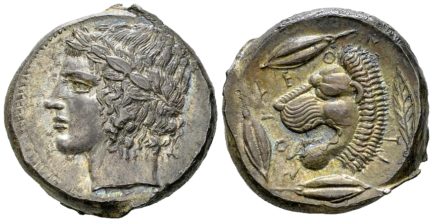 Obv. Laureate head of Apollo left. Rev. Lion's head left, with open jaws and tongue protruding, around which LEONTINON; laurel leaf behind, three barley-corns around. Boehringer, Leontinoi 55 (same dies); Rizzo pl. XXIV, 4 (same dies); SNG ANS 257 (same dies).