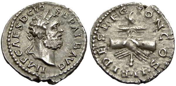 Clodius Albinus, as Augustus (195-196 AD). AR Denarius (18 mm, 3.36 g), Lugdunum (Lyon). Obv. IMP CAES D CLO SEP ALB AVG, laureate head right. Rev. FIDES LEGION COS II, clasped hands; leagionary eagle behind. RIC IV, 1, p. 47, 20b.