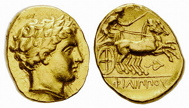 Kings of Macedon. Philip II (359-336 BC). AV Stater (8.58 g), Amphipolis mint., c. 340/336-328 BC. Obv. Laureate head of Apollo right. Rev. Charioteer driving biga right; ivy leaf below, ΦΙΛΙΠΠΟΥ in exergue. Le Rider 62; SNG ANS 250-254.
