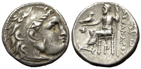 Kings of Macedon. Alexander III. "the Great" (336-323 BC). AR Drachm (17 mm, 4.16 g), Magnesia mint. Obv. Head of Herakles right, wearing lion's skin. Rev. Zeus Aëtophoros seated left, legs crossed, ΑΛΕΞΑΝΔΡΟΥ to right; head of lion in left field, P below throne. Price p. 270, 1989.