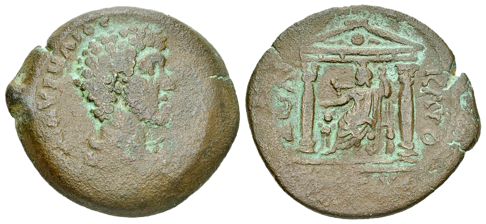 Marcus Aurelius as Caesar (138-161 AD). AE Drachm (35 mm, 24.65 g), Alexandria, Egypt. RY 12 = 148-149 AD. Obv. M AYPHΛIOC KAICAP, bare-headed, draped and cuirassed bust right. Rev. ΔΩΔEKATOY, Serapis in temple left, Kerberos at feet. K./G. 37.23.
