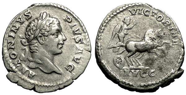 Lot 90. Caracalla Denarius, Victory in biga reverse, scarce