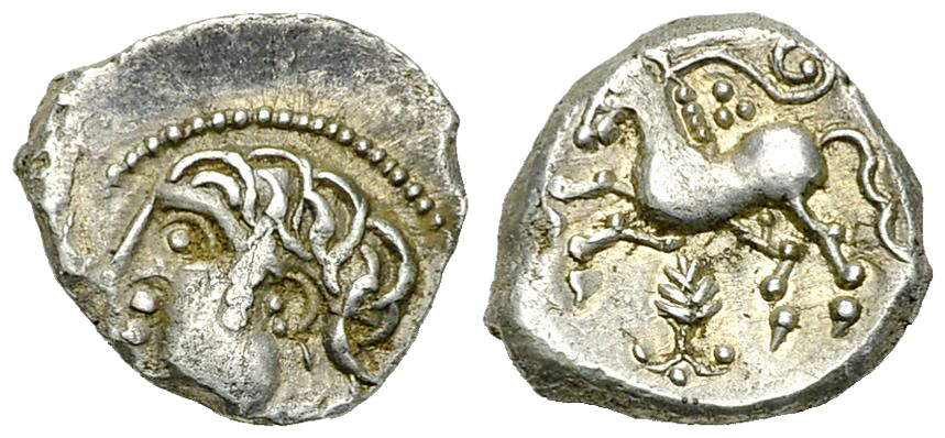 Gaul, Averni. AR Quinarius (14-15 mm, 1.94 g), 2nd-1st century BC. Obv. Head left. Rev. Horse prancing left, volute behind, pine cone shaped ornament below. Delestrée/Tache 3389; BN 3815.